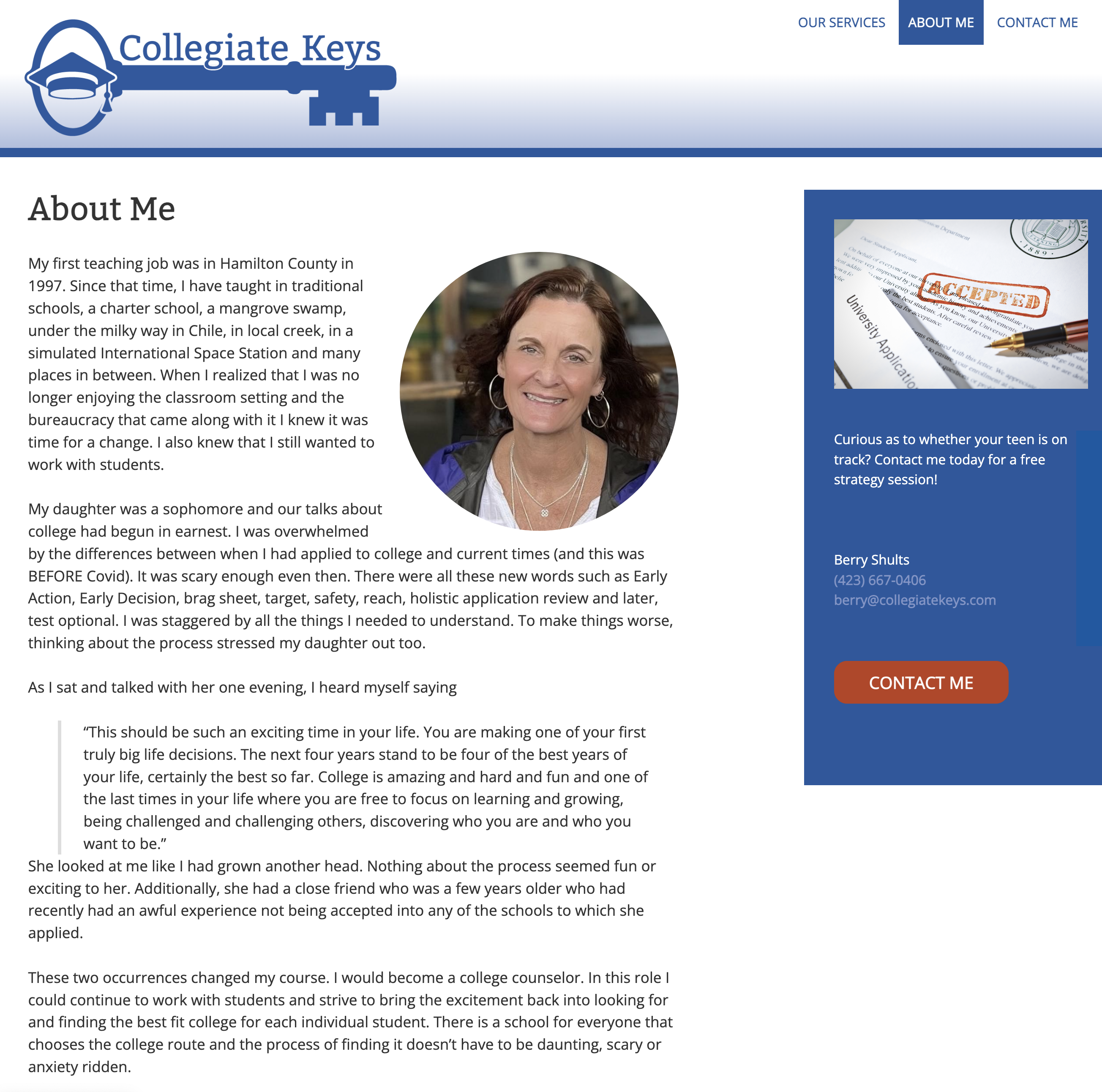 When we first started working with her, Berry was beginning her second career. With two almost-grown children, she had decided to leave teaching and was working on her college counseling certification.